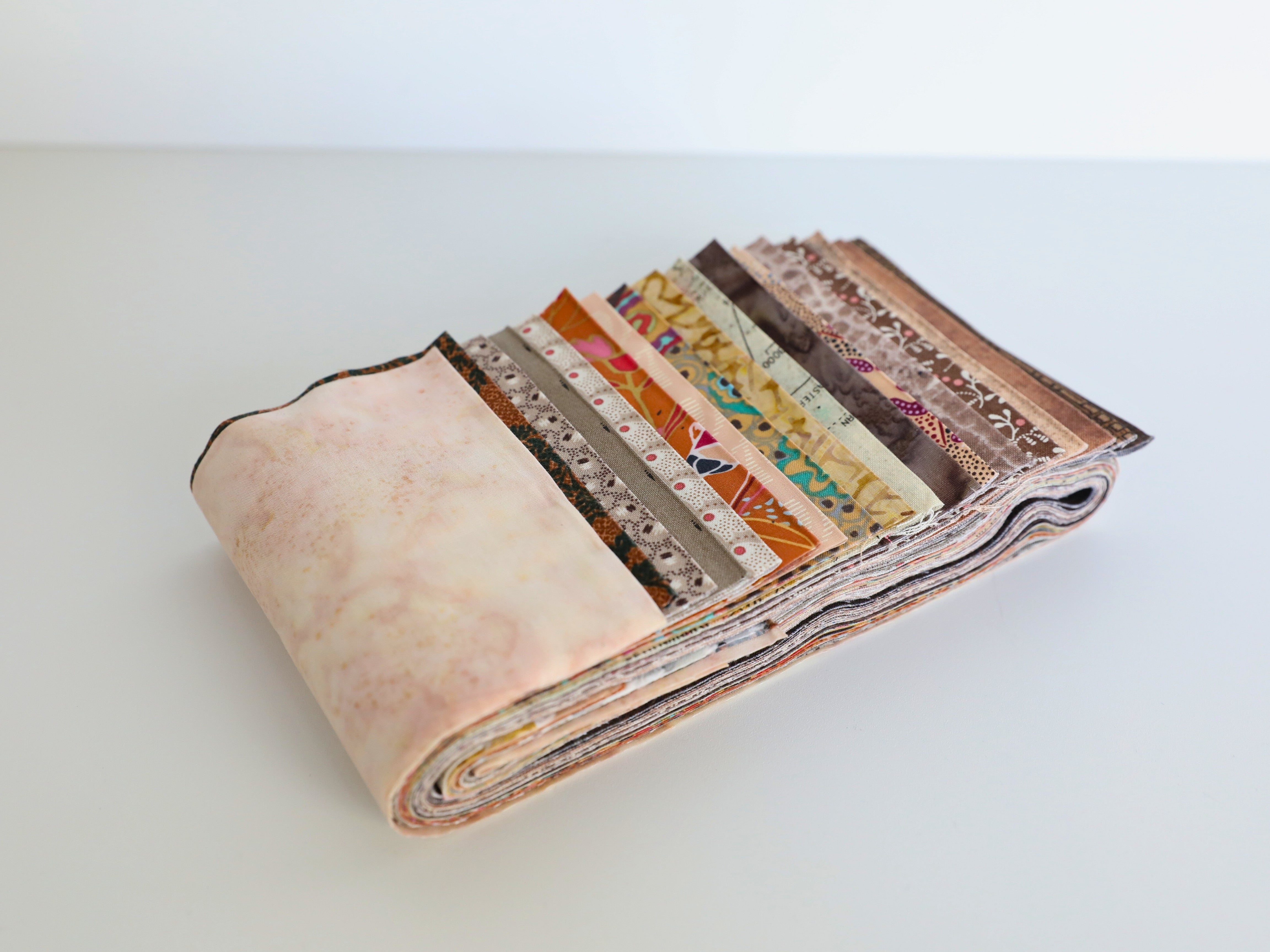 Curated fabric bundle in a spectrum of cream and brown, from light to dark. Each fabric bundle includes 18 different fabrics cut at an 1/8 of a yard by width of fabric (4.5" x 44").