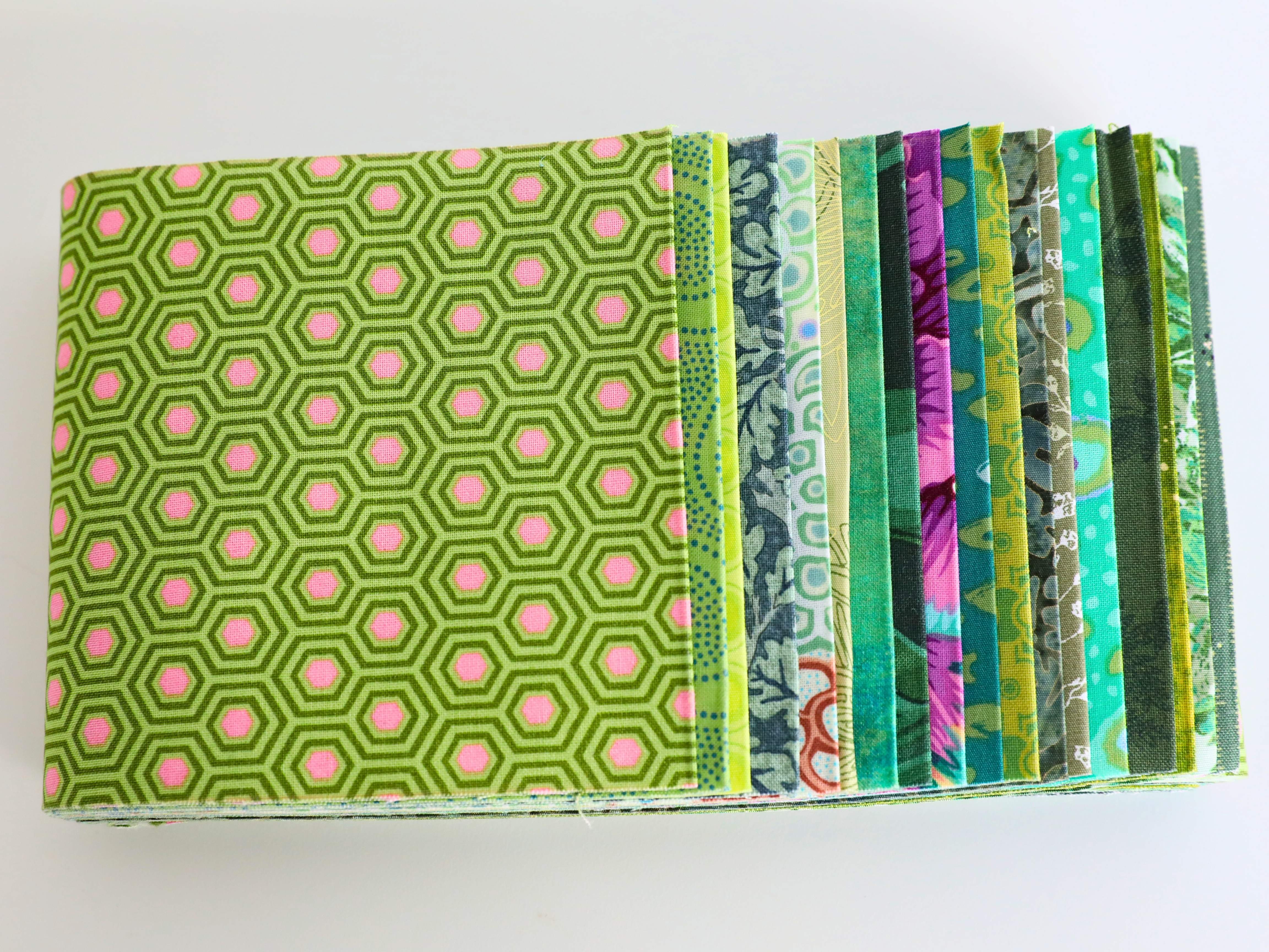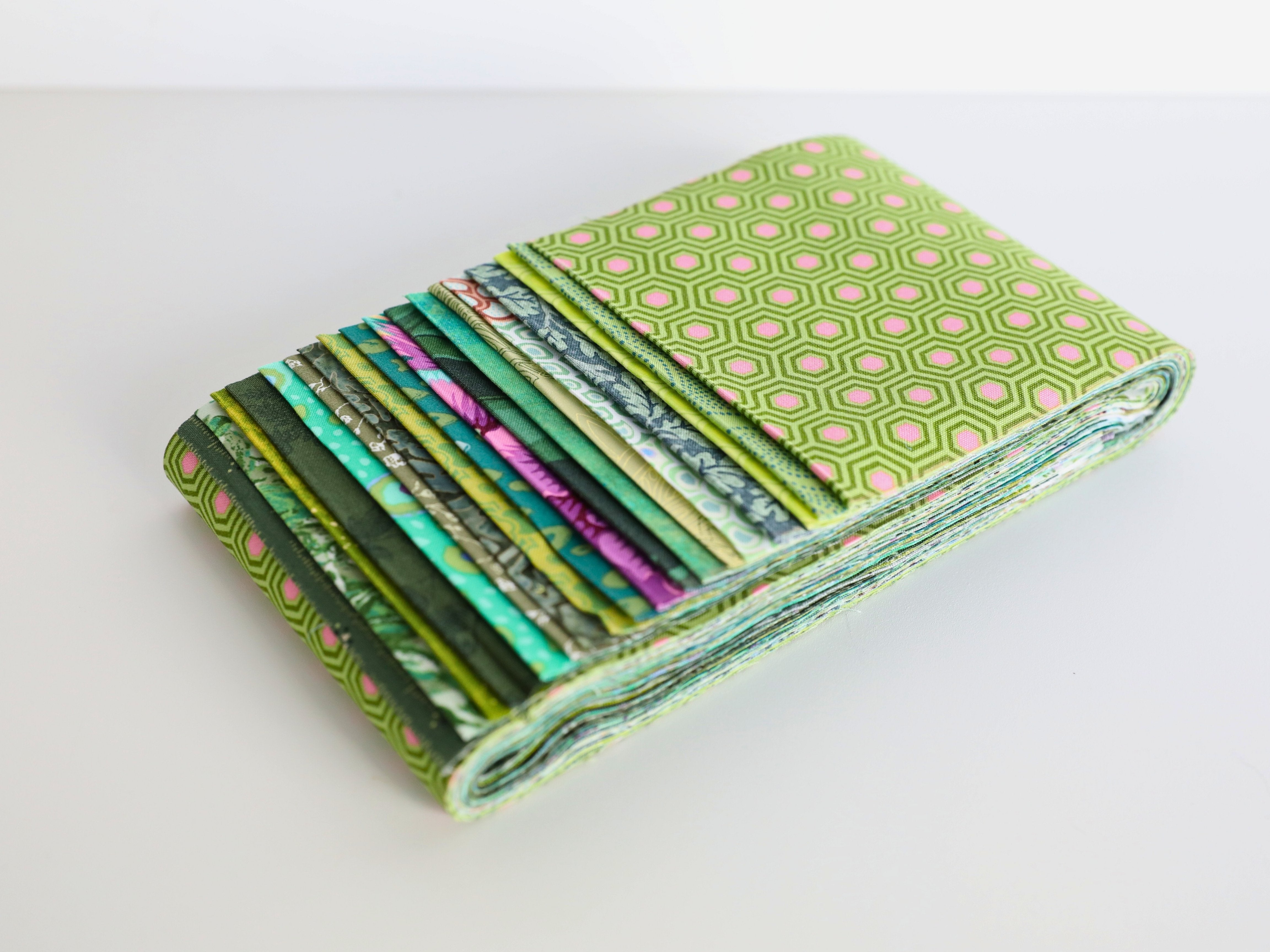 Curated fabric bundle in a spectrum of green, from light to dark AND warm to cool. Each fabric bundle includes 18 different fabrics cut at an 1/8 of a yard by width of fabric (4.5" x 44").