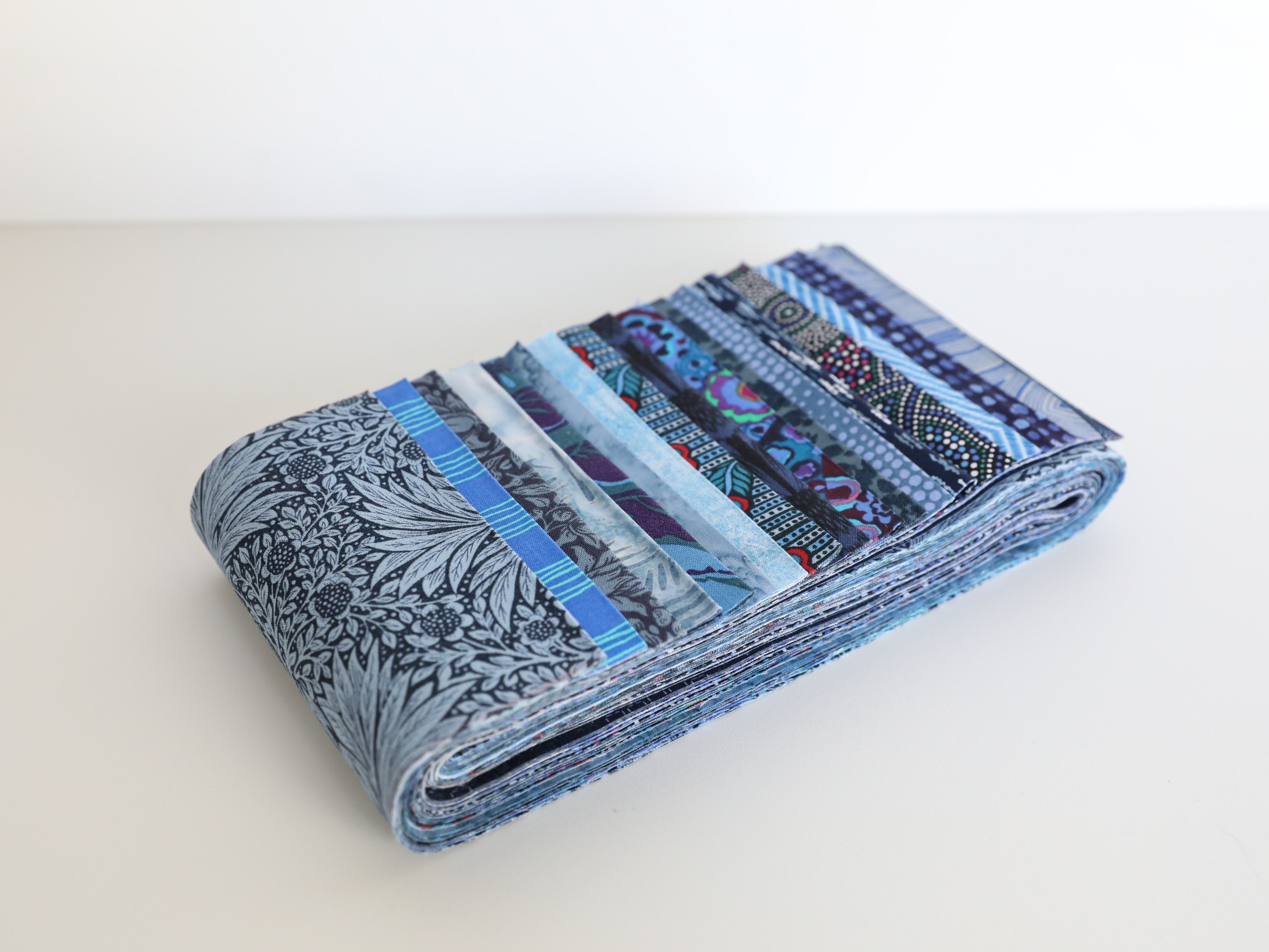 Curated fabric bundle in a spectrum of blue, from light to dark AND cool to warm. Each fabric bundle includes 18 different fabrics cut at an 1/8 of a yard by width of fabric (4.5" x 44").